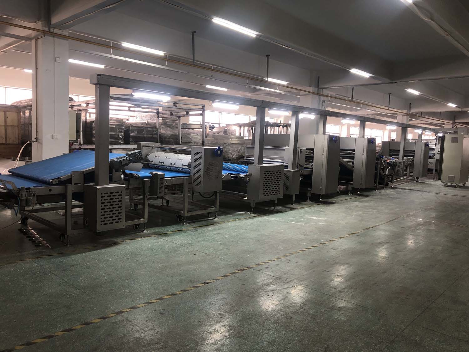 Một bộ dây chuyền trang điểm bao gồm máy trộn, máy nâng bát, máy cắt bột và máy cắt bánh mì dẹt, sau đó, bánh mì phẳng được vận chuyển đến lò hầm nhiều tầng được thiết kế đặc biệt để nướng trong thời gian ngắn và được làm mát bằng băng tải làm mát nhiều lớp trước khi đóng gói.